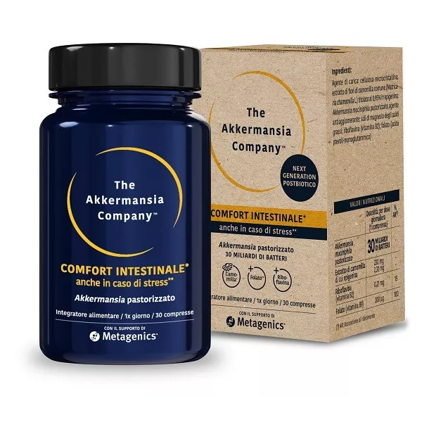 Descrizione Integratore alimentare con: Akkermansia muciniphila pastorizzato + estratto di camomilla (contribuisce alla regolare motilità gastrointestinale), + folato (contribuisce alla normale funzione psicologica), + riboflavina (contribuisce al mantenimento di membrane mucose normali).