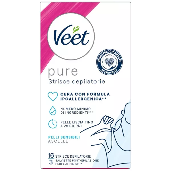 Non gettare nel WC. Conservare la confezione esterna. Leggere attentamente e seguire tutte le precauzioni e le istruzioni d'uso prima dell'utilizzo. Adatte all'uso sulle ascelle. Non adatte all'uso su cuoio capelluto, viso, occhi, naso, orecchie, zone perianali, genitali e capezzoli o su qualsiasi altra parte del corpo. Non utilizzare su vene varicose, cicatrici, nei, brufoli, lesioni, irritazioni, scottature o su pelli che in passato abbiano evidenziato una reazione avversa alle cere. Attendere 72 ore tra una depilazione e l'altra. Consultare il proprio medico prima dell'uso se si stanno assumendo medicinali che possono avere effetti sulla pelle o se si soffre di disturbi legati alla pelle. L'uso delle cere depilatorie non è indicato per persone anziane, diabetiche o che assumono retinoidi orali. Se il prodotto non è mai stato utilizzato prima, si consiglia di iniziare rimuovendo i peli delle gambe. Solo dopo aver acquisito esperienza passare alle zone sensibili delle ascelle. Prima dell'uso, assicurarsi che la pelle sia asciutta, non irritata e priva di creme, olii o deodoranti. Prima di ogni depilazione, verificare la reazione della pelle applicando la cera su una piccola parte della zona che si desidera trattare, seguendo le istruzioni per l'uso. Se dopo 24 ore non si evidenziano reazioni avverse, procedere con l'applicazione. Se si avvertono sensazioni di bruciore/pizzicore durante l'uso, rimuovere subito la cera con il retro di una striscia usata, una salvietta post-epilazione o dell'olio per bambini, quindi risciacquare abbondantemente con acqua fredda. Se l'irritazione persiste, consultare un medico. Non applicare la cera per più di una volta sulla stessa area. Dopo l'uso, la pelle può risultare più sensibile per un breve periodo, quindi evitare di grattarsi. Dopo la depilazione, si consiglia di attendere 24 ore prima di applicare antitraspiranti o qualsiasi altro prodotto profumato, di sottoporsi a trattamenti di abbronzatura artificiale, nuotare o esporsi al sole. Se si terminano le salviette Perfect Finish, per rimuovere i residui di cera è possibile utilizzare dell'olio per bambini. Non utilizzare acqua, sapone o alcool per rimuovere la cera. Tenere fuori dalla portata dei bambini. In caso di ingestione, consultare immediatamente un medico e mostrare la confezione. Evitare il contatto con gli occhi. In caso di contatto con gli occhi, sciacquare immediatamente con abbondante acqua e consultare un medico.