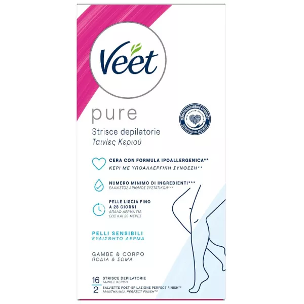 Conservare la confezione esterna. Leggere attentamente e seguire tutte le precauzioni e le istruzioni d'uso prima dell'utilizzo. Adatte all'uso sulle ascelle. Non adatte all'uso su cuoio capelluto, viso, occhi, naso, orecchie, zone perianali, genitali e capezzoli o su qualsiasi altra parte del corpo. Non utilizzare su vene varicose, cicatrici, nei, brufoli, lesioni, irritazioni, scottature o su pelli che in passato abbiano evidenziato una reazione avversa alle cere. Attendere 72 ore tra una depilazione e l'altra. Consultare il proprio medico prima dell'uso se si stanno assumendo medicinali che possono avere effetti sulla pelle o se si soffre di disturbi legati alla pelle. L'uso delle cere depilatorie non è indicato per persone anziane, diabetiche o che assumono retinoidi orali. Se il prodotto non è mai stato utilizzato prima, si consiglia di iniziare rimuovendo i peli delle gambe. Solo dopo aver acquisito esperienza passare alle zone sensibili delle ascelle. Prima dell'uso, assicurarsi che la pelle sia asciutta, non irritata e priva di creme, olii o deodoranti. Prima di ogni depilazione, verificare la reazione della pelle applicando la cera su una piccola parte della zona che si desidera trattare, seguendo le istruzioni per l'uso. Se dopo 24 ore non si evidenziano reazioni avverse, procedere con l'applicazione. Se si avvertono sensazioni di bruciore/pizzicore durante l'uso, rimuovere subito la cera con il retro di una striscia usata, una salvietta post-epilazione o dell'olio per bambini, quindi risciacquare abbondantemente con acqua fredda. Se l'irritazione persiste, consultare un medico. Non applicare la cera per più di una volta sulla stessa area. Dopo l'uso, la pelle può risultare più sensibile per un breve periodo, quindi evitare di grattarsi. Dopo la depilazione, si consiglia di attendere 24 ore prima di applicare antitraspiranti o qualsiasi altro prodotto profumato, di sottoporsi a trattamenti di abbronzatura artificiale, nuotare o esporsi al sole. Se si terminano le salviette Perfect Finish, per rimuovere i residui di cera è possibile utilizzare dell'olio per bambini. Non utilizzare acqua, sapone o alcool per rimuovere la cera. Tenere fuori dalla portata dei bambini. In caso di ingestione, consultare immediatamente un medico e mostrare la confezione. Evitare il contatto con gli occhi. In caso di contatto con gli occhi, sciacquare immediatamente con abbondante acqua e consultare un medico.