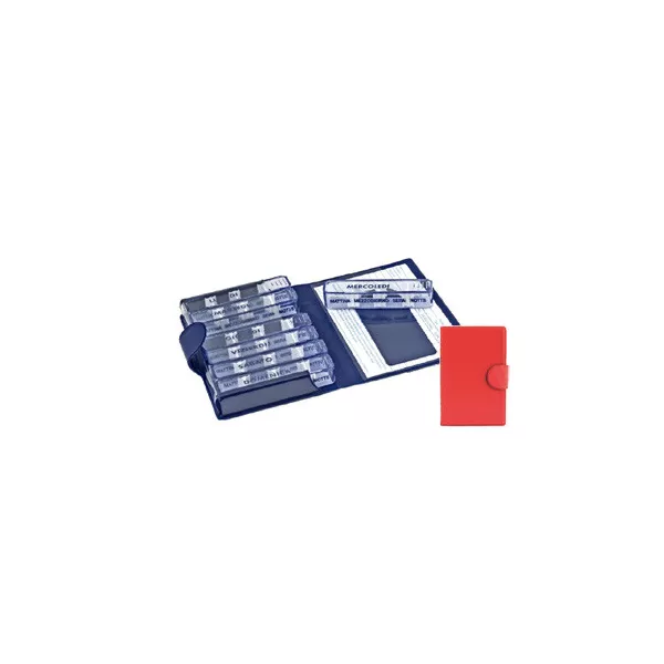 Pratico astuccio settimanale contenente 7 portapillole giornalieri, ciascuno dei quali munito di 3 pareti interne regolabili (4 spazi) per: mattino, mezzogiorno, sera, notte.