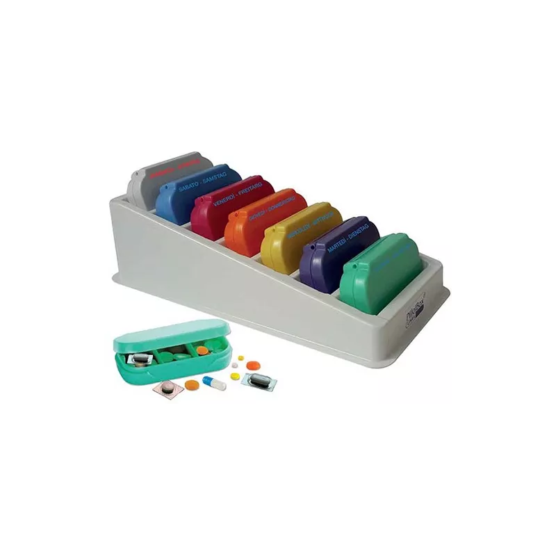 Nuovo portapillole settimanale che aiuta ad assumere in modo corretto e nei tempi i vari medicinali in capsule o compresse prescritti dal vostro medico. Novità composto da 7 portapillole mini tascabili da 3 scomparti di facile identificazione grazie anche ai diversi colori giornalieri, posizionati nella pratica base da tavolo. Indicato per chi deve assumere quantità e dosaggi limitati o farmaci di piccole dimensioni. Pratici per essere all'occorrenza portati con se anche durante la giornata.