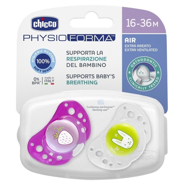 Succhietto dotto di speciale scudo studiato per la massima areazione della pelle, con tettina attiva che favorisce attivamente il corretto sviluppo della bocca, fori anti-irritazione: garantiscono la circolazione dell'aria evitando il ristagno della saliva e lasciando la pelle libera di respirare, forma ergonomica che si adatta al viso del bambino, garantendo lo spazio corretto per il naso e il mento e bordi arrotondati: per appoggiarsi delicatamente sulla pelle.