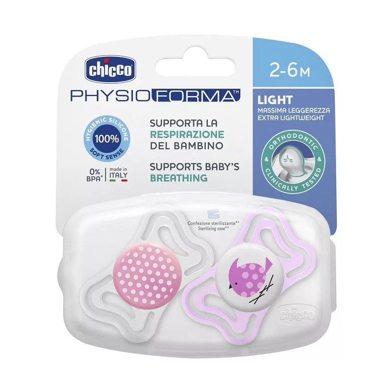 Il succhietto PhysioForma Light Chicco 2-6 mesi con tettarella in silicone è pensato per offrire al bambino la massima leggerezza unita ad un nuovo design. Il succhietto Chicco PhysioForma Light 2-6 mesi in silicone, grazie alla sua esclusiva forma, favorisce il corretto sviluppo della bocca e aiuta a posizionare la lingua in avanti supportando la respirazione fisiologica. Chicco PhysioForma Light 2-6 mesi è in silicone, materiale scelto per la sua praticità, igienico e indeformabile. L’esclusiva finitura Soft Tense lo rende morbido e vellutato.