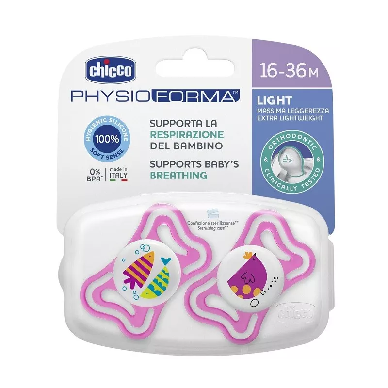 Il succhietto PhysioForma Light Chicco 16-36 mesi con tettarella in silicone è pensato per offrire al bambino la massima leggerezza unita ad un nuovo design. Il succhietto Chicco PhysioForma Light 16-36 mesi in silicone, grazie alla sua esclusiva forma, favorisce il corretto sviluppo della bocca e aiuta a posizionare la lingua in avanti supportando la respirazione fisiologica. Chicco PhysioForma Light 16-36 mesi è in silicone, materiale scelto per la sua praticità, igienico e indeformabile. L’esclusiva finitura Soft Tense lo rende morbido e vellutato.