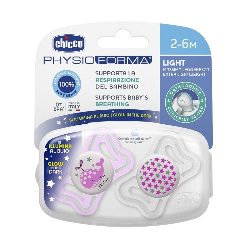 Il succhietto physioforma light chicco 2-6m con tettarella in silicone è pensato per offrire al bambino la massima leggerezza unita ad un nuovo ed innovativo design. Il succhietto chicco physioforma light 2-6m in silicone, grazie alla sua esclusiva forma, favorisce il corretto sviluppo della bocca e aiuta a posizionare la lingua in avanti supportando la respirazione fisiologica. Chicco physioforma light 2-6m è in silicone, materiale scelto per la sua praticità, igienico e indeformabile. l'esclusiva finitura soft sense lo rende morbido e vellutato.