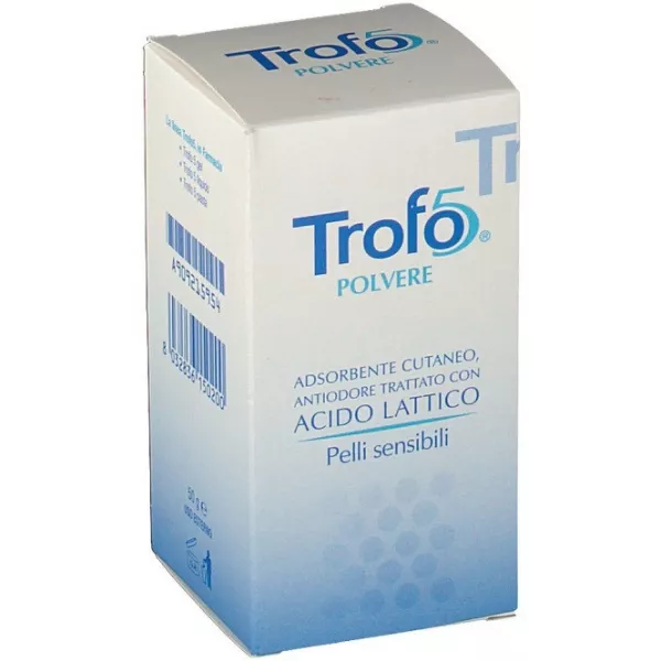 Descrizione È una miscela di polveri, trattata con acido lattico e arricchita con idrossido di alluminio e amido di mais. Trofo 5 polvere, grazie alle sue caratteristiche formulative, svolge varie azioni complementari: adsorbente, antitraspirante, antiodore ed emolliente. Svolge la funzione deodorante per "adsorbimento" e non per profumazione.