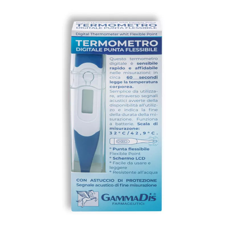 Termometro digitale a punta flessibile dotato di rapidità e affidabilità nelle misurazioni, semplice da utilizzare: in circa 60 secondi rileva la temperatura corporea.