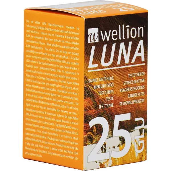 La striscia reattiva per la misurazione della glicemia Wellion LUNA è prevista per la misurazione dei valori glicemici nel sangue intero per l'autocontrollo con i misuratori della serie Wellion LUNA a casa e presso siti clinici da parte di operatori sanitari (diagnostica in-vitro).