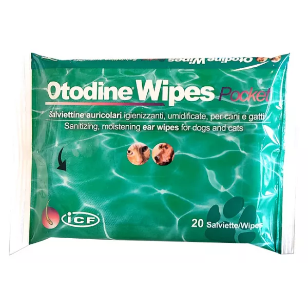 Salviettine auricolari igienizzanti, umidificate, per cani e gatti.