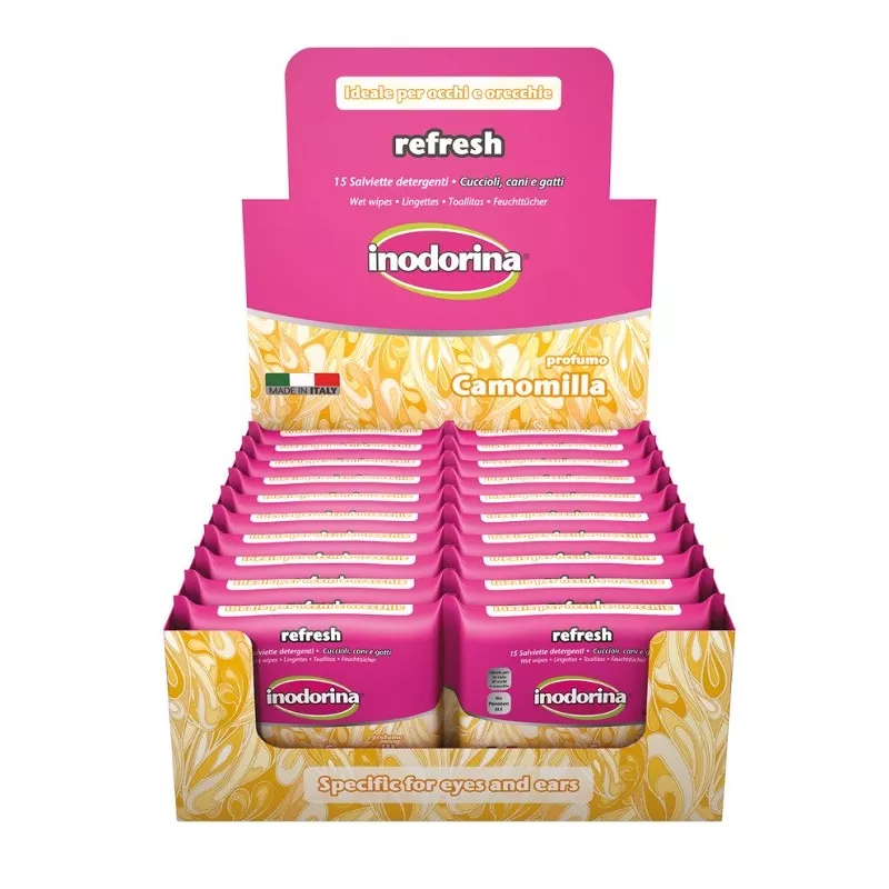 Morbide salviette detergenti particolarmente indicate per detergere con delicatezza gli occhi e le orecchie degli animali. La formula emolliente, rispettando il pH naturale, neutralizza le molecole di cattivo odore rilasciando una gradevole profumazione alla camomilla.
