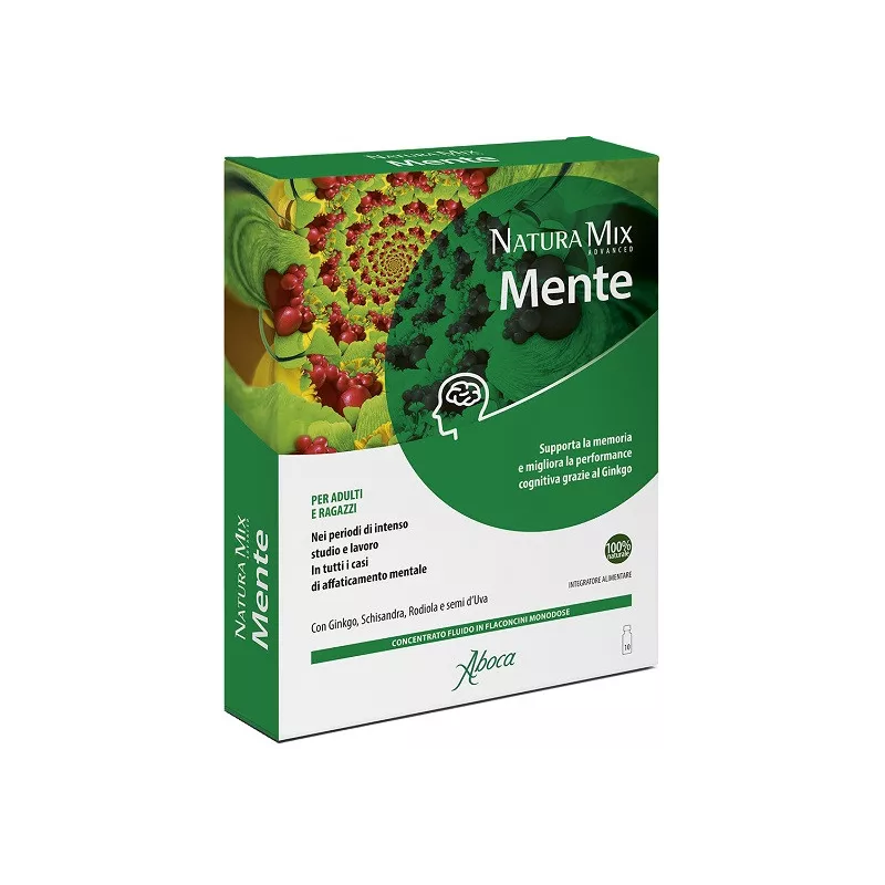 Natura Mix Advanced Mente supporta la memoria e favorisce la performance cognitiva grazie all’estratto di Ginkgo. Il prodotto inoltre, grazie all’estratto di Schisandra, può aumentare la capacità di una persona di adattarsi allo stress e in particolare, l’estratto di Rodiola ha un’attività tonico-adattogena che aiuta l’organismo ad adattarsi allo stress emotivo, lo sforzo fisico, aiuta a stimolare il sistema nervoso e ha un effetto benefico in caso di fatica e mal di testa indotto. La formulazione è arricchita dall’estratto di semi d’Uva ad attività antiossidante. Per queste sue caratteristiche Natura Mix Advanced Mente è utile: - nei periodi di intenso studio e lavoro; - in tutti i casi in cui si desidera supportare la memoria e le funzioni cognitive.