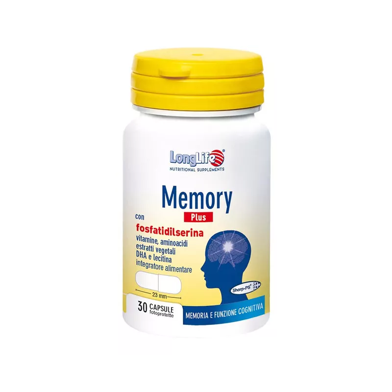 Descrizione Integratore alimentare di fosfatidilserina con vitamine, aminoacidi, estratti vegetali, DHA e lecitina, utile per la memoria e la funzione cognitiva.