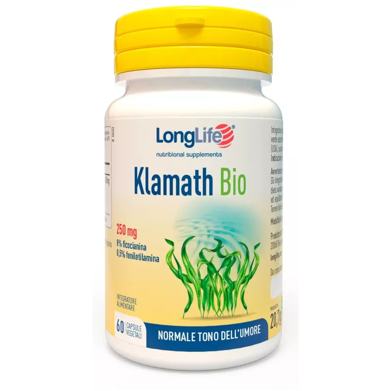 Descrizione Integratore alimentare a base di klamath biologica, microalga verde-azzurra che cresce selvatica nell'omonimo lago in Oregon (USA), un'area incontaminata di origine vulcanica.