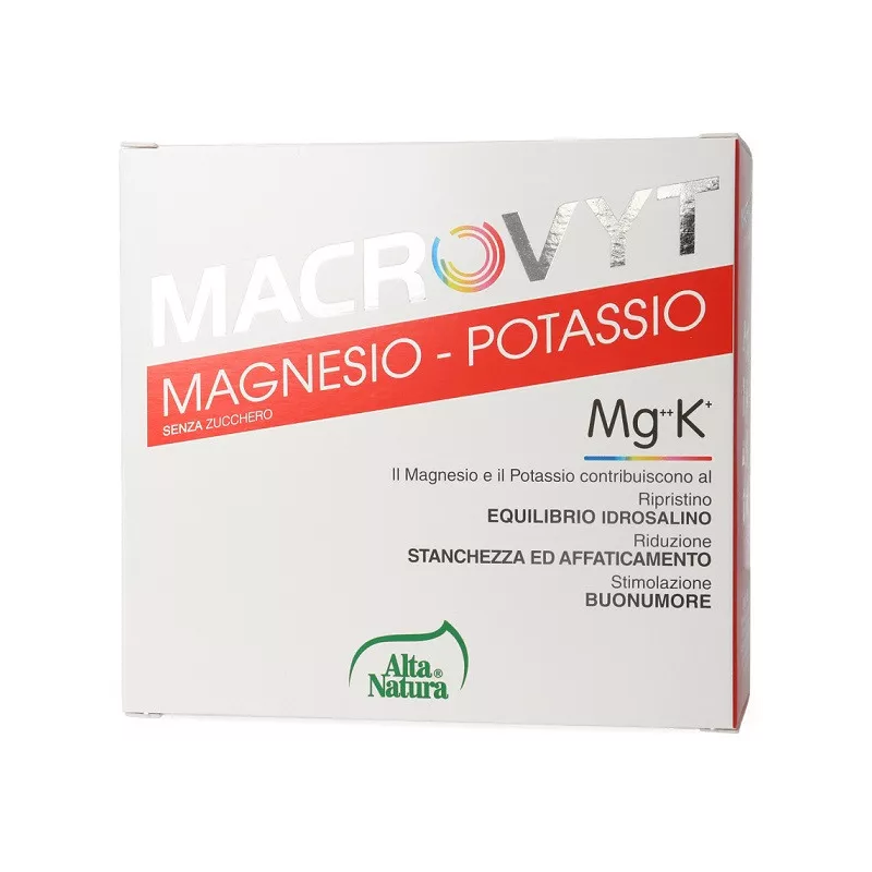 Descrizione Macrovyt è un integratore alimentare di Magnesio e Potassio, con Vitamina C da fonte naturale, Vitamina E ed Acido Folico. Indicato in tutti i casi di ridotto apporto dei suddetti componenti con la dieta o di aumentato fabbisogno degli stessi. Favorisce il recupero ed il mantenimento dei naturali livelli fisiologici dei suoi componenti.
