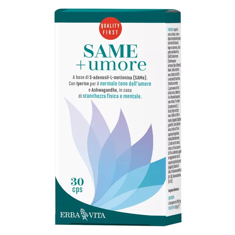 Descrizione Integratore alimentare con SAMe, composto naturalmente presente nell'organismo che partecipa alla sintesi dei neurotrasmettitori, estratti vegetali e vitamine.