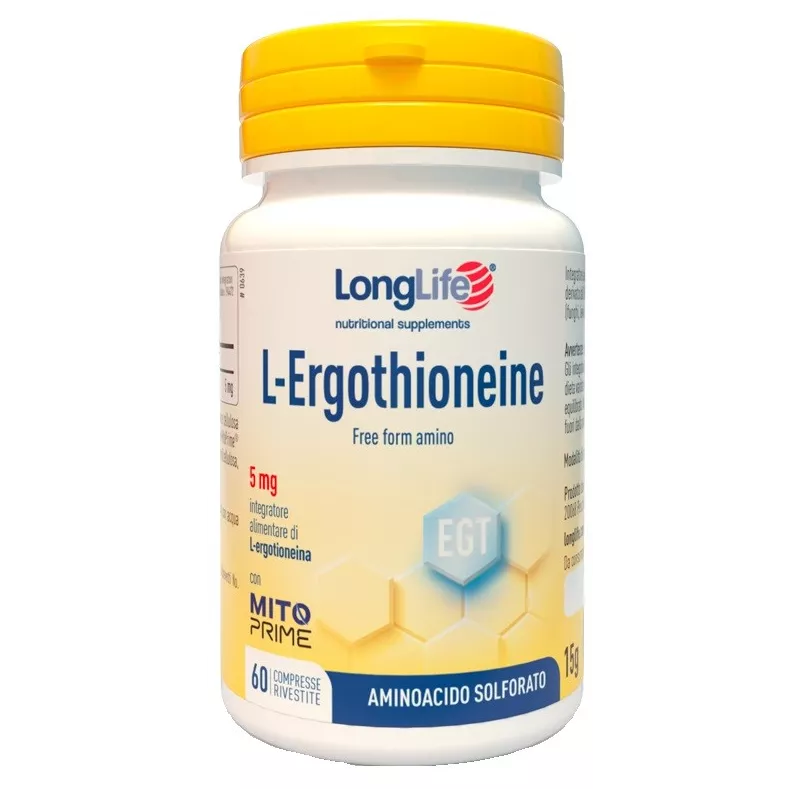 Descrizione Integratore alimentare di L-ergotioneina, un aminoacido solforato derivato dall'istidina con proprietà antiossidanti che si trova in piccole quantità in alcuni alimenti (funghi, lievito, cereali integrali e alcuni tipi di carne).