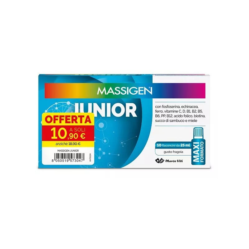 Descrizione Integratore alimentare accuratamente formulato con selezionate materie prime, studiato per la fascia di età dai 4 ai 14 anni. Contiene ferro, vitamine PP e B12 che contribuiscono alla riduzione della stanchezza e dell’affaticamento, le vitamine B1 e B6 che aiutano la normale funzione psicologica, fosfoserina che è un componente strutturale normalmente presente nelle cellule cerebrali, estratto secco di echinacea, vitamine D e C che favoriscono le naturali difese dell’organismo. La formulazione è arricchita dalla presenza del succo di sambuco e miele. Massigen JUNIOR è indicato in caso di ridotto apporto nella dieta o di un aumentato fabbisogno fisiologico di tali nutrienti.
