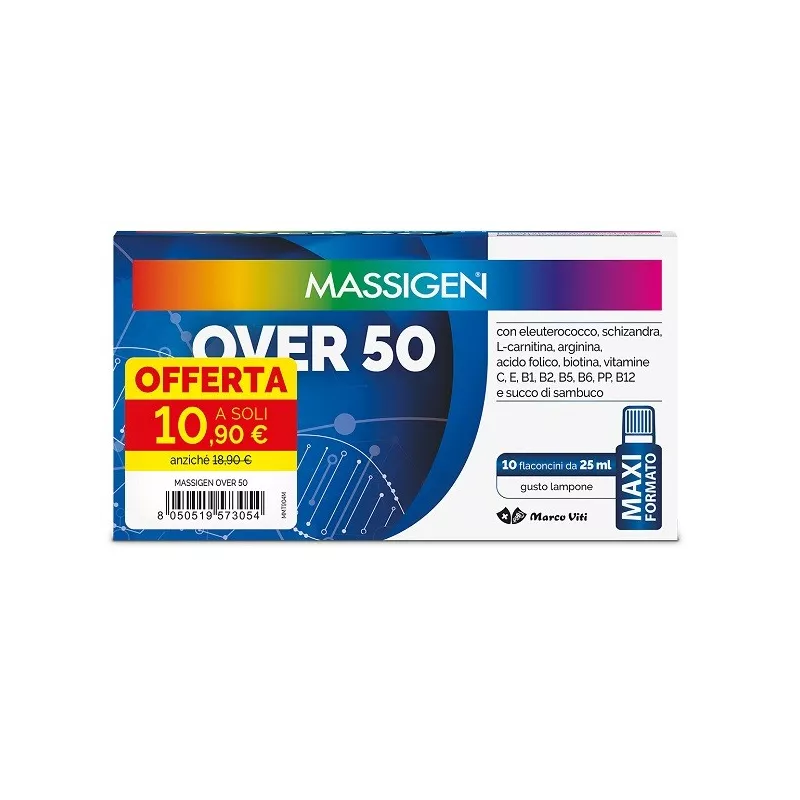 Descrizione Integratore alimentare accuratamente formulato con selezionate materie prime, studiato per la fascia di età dai 50 anni. Contiene estratto fluido di eleuterococco dalle proprietà tonico-adattogene che possono risultare utili per l’attività fisica, vitamine PP e B12 che contribuiscono alla riduzione della stanchezza e dell’affaticamento. L’estratto fluido di schizandra ha proprietà tonico-adattogene che possono risultare utili per l’attività mentale, le vitamine B1 e B6 aiutano la normale funzione psicologica. La carnitina è una molecola presente naturalmente nelle nostre cellule e ha un ruolo chiave per il metabolismo dei grassi per la produzione di energia. La formulazione è arricchita dalla presenza di arginina e vitamine C ed E. Massigen OVER 50 è indicato in caso di ridotto apporto nella dieta o di un aumentato fabbisogno fisiologico di tali nutrienti. Con succo di sambuco.