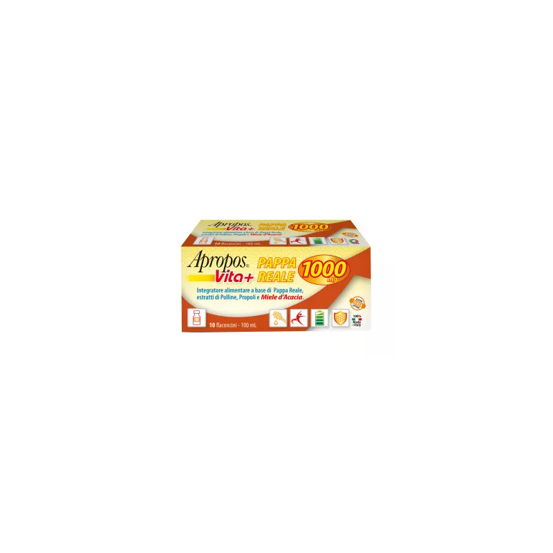 Apropos Vita+ Pappa Reale 1.000 mg è un integratore alimentare con un'altissima concentrazione di pappa reale fresca, nota sostanza prodotta dalle api come nutrimento esclusivo dell'ape regina. La sua formulazione si completa di polline, propoli e pregiato miele d'acacia, altri preziosi elementi dell'alveare. Il suo dosaggio molto ricco è particolarmente indicato per una pronta azione di sostegno. Il gusto squisito dato dal miele e i suoi pratici flaconcini monodose, lo rendono infine un prodotto adatto a tutta la famiglia.