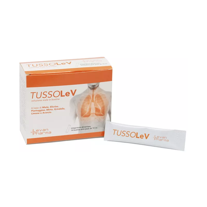 TUSSOLeV soluzione orale in bustine è un integratore alimentare a base di Miele, Elicriso, Piantaggine, Mirto, Grindelia, Limone e Arancio. L’Elicriso contribuisce al benessere di naso e gola ed ha un effetto balsamico. La Piantaggine svolge un’azione emolliente e lenitiva (mucosa orofaringea) ed è utile al tono della voce. La Grindelia sostiene la funzionalità delle prime vie respiratorie. Il Mirto contribuisce alla fluidità delle secrezioni bronchiali.