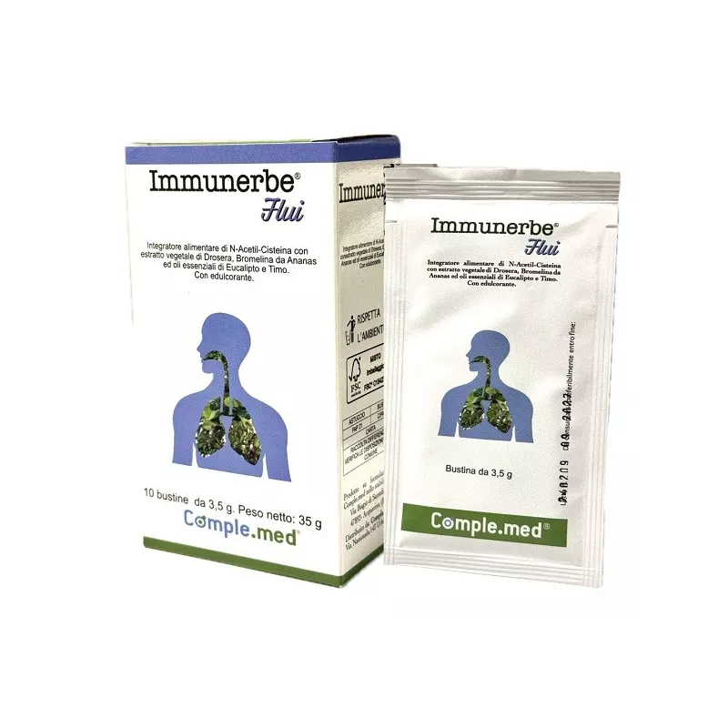 Descrizione Immunerbe Flui è un integratore alimentare di N-acetil-cisteina con estratto vegetale di drosera e bromelina da ananas ed oli essenziali di eucalipto e timo indicato per fornire un apporto supplementare di tali nutrienti in caso di carenza o accresciuto fabbisogno. Drosera e timo favoriscono la fluidità delle secrezioni bronchiali; drosera ed eucalipto hanno un'azione emolliente e lenitiva sulla mucosa orofaringea e favoriscono il tono della voce; l'eucalipto ha un effetto balsamico.