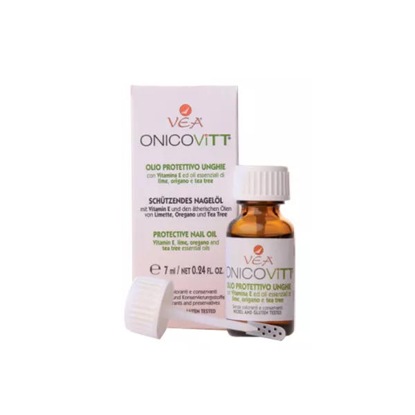 Olio protettivo ungueale antiossidante con vitamina E ed oli essenziali di lime, origano e tea tree. Vea Onicovitt è un olio innovativo per il benessere delle unghie costituito da vitamina E, antiossidante, e da una miscela brevettata di oli essenziali (lime, origano, tea tree) che favoriscono l'azione antimicrobica. Non contiene acqua, conservanti, eccipienti e coloranti, per minimizzare i rischi di allergia. Mantiene in buono stato le unghie e la cute periungueale. Indicato nei casi di alterazioni ungueali da agenti esterni.