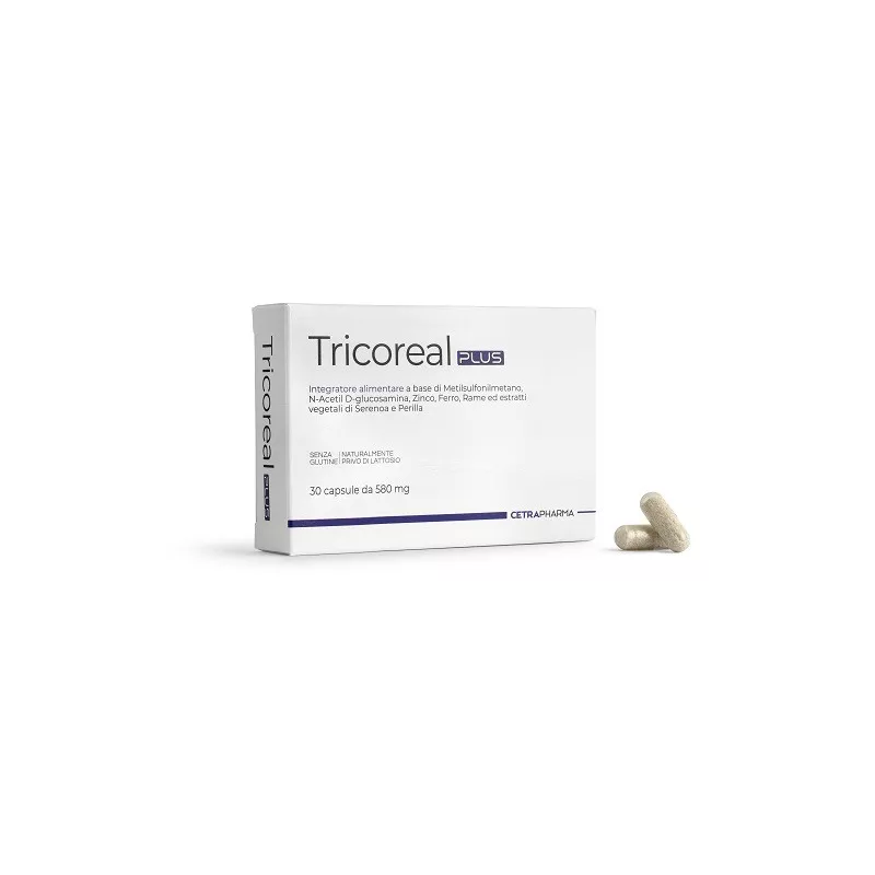 Descrizione Tricoreal PLUS è un integratore alimentare a base di metilsulfonilmetano, N-acetil D-glucosamina, zinco, ferro, rame ed estratti vegetali di serenoa e perilla, indicato in caso di scarso apporto con la dieta o aumentato fabbisogno di tali nutrienti. Il rame contribuisce alla normale pigmentazione dei capelli, mentre lo zinco contribuisce al mantenimento di capelli e unghie normali. L'N-acetil D-glucosamina interviene nella sintesi dell'acido ialuronico.