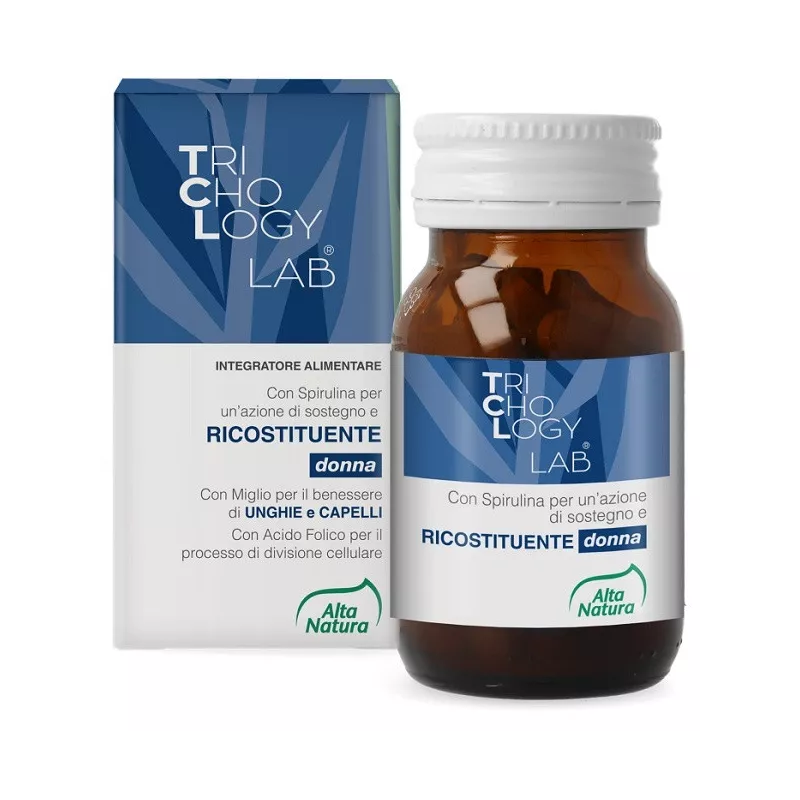 Integratore alimentare ricostituente per capelli donna Trichology Lab restituisce al capello forza, robustezza, pettinabilità e volume, coadiuva il fisiologico ciclo di crescita dei capelli, nutrendoli ed aiutandone la ricrescita, agendo su capello e bulbo pilifero. I principi attivi contenuti nella polvere micronizzata di spirulina favoriscono un'azione di sostegno e ricostituente, mentre il miglio agisce sul benessere di unghie e capelli. Con aggiunta di estratti secchi di soia, fieno greco e luppolo. Grazie al contenuto di cheratina idrolizzata, amminoacidi cistina e metionina ed acido folico contribuisce alla normale funzione del sistema immunitario e sintesi di altri amminoacidi, necessari al fabbisogno del capello.
