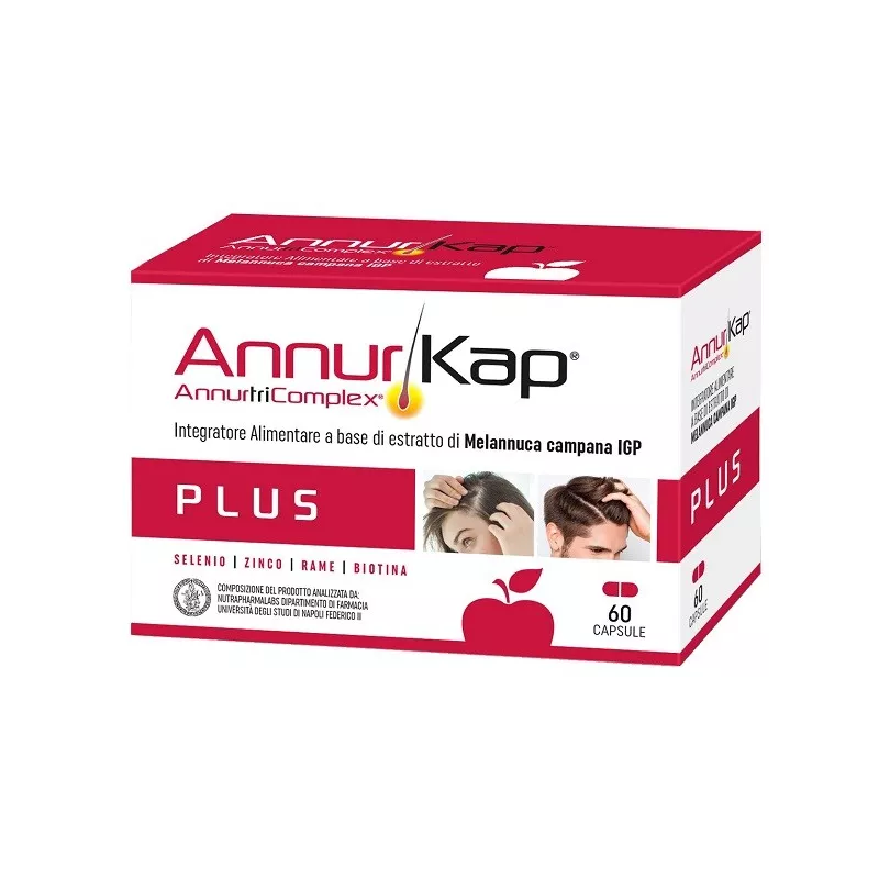 Descrizione Integratore alimentare a base di AnnutriComplex Plus, un fitocomplesso di melannurca titolato in procianidina B2 arricchito in rame, biotina e selenio da L-selenometionina, con zinco. La melannurca è una varietà di mela IGP della Campania ad alto contenuto di procianidine. Selenio e biotina contribuiscono al mantenimento di capelli normali. Il selenio contribuisce, inoltre, alla protezione delle cellule dallo stress ossidativo.