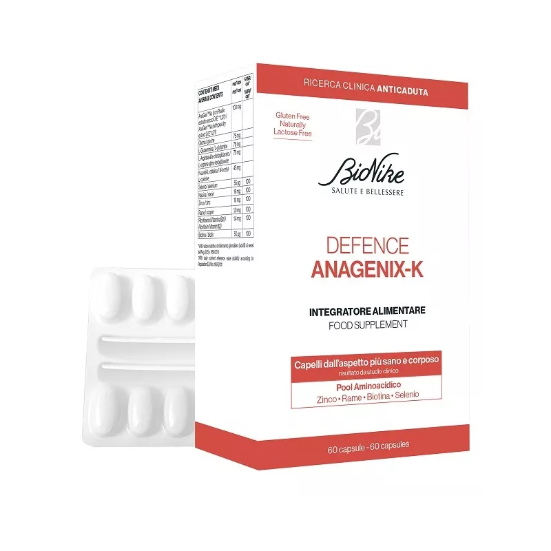 Descrizione Integratore alimentare a base di glicina, glutammina, arginina alfa-chetoglutarato, N-acetilcisteina e AnaGain Nu che migliora la struttura del capello dopo due mesi di assunzione. Contiene biotina e selenio che favoriscono il mantenimento di capelli normali e rame che supporta la fisiologica pigmentazione dei capelli. Zinco, selenio e rame contribuiscono alla protezione delle cellule dallo stress ossidativo.
