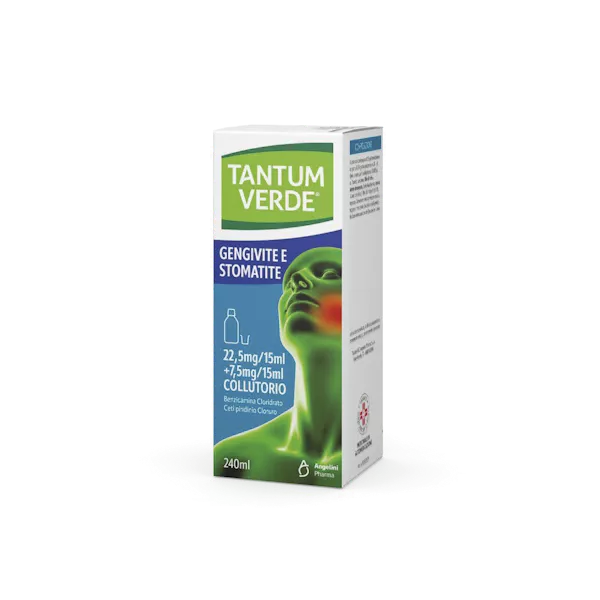 TANTUM VERDE GENGIVITE E STOMATITE contiene i principi attivi benzidamina cloridrato (un antinfiammatorio non steroideo) e cetilpiridinio cloruro (un antisettico).