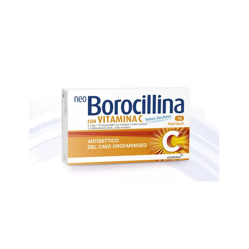 Neo Borocillina pastiglie con vitamina C senza zucchero contiene i principi attivi 2,4 diclorobenzil alcool e acido ascorbico ed appartiene ad una categoria di farmaci detti antisettici (antibatterici) del cavo orofaringeo (bocca e gola), utilizzati per la cura dei sintomi delle malattie infiammatorie della bocca e della gola.