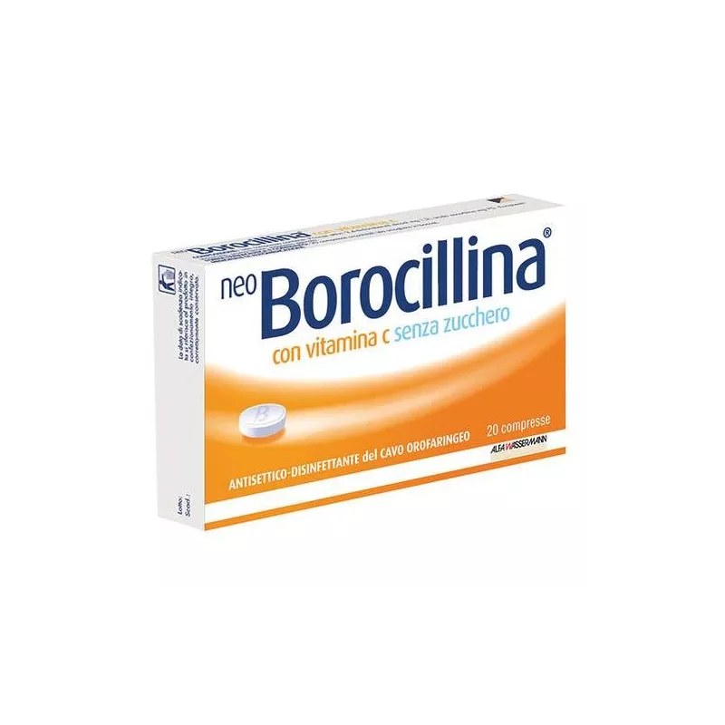 Neo Borocillina pastiglie con vitamina C senza zucchero contiene i principi attivi 2,4 diclorobenzil alcool e acido ascorbico ed appartiene ad una categoria di farmaci detti antisettici (antibatterici) del cavo orofaringeo (bocca e gola), utilizzati per la cura dei sintomi delle malattie infiammatorie della bocca e della gola.