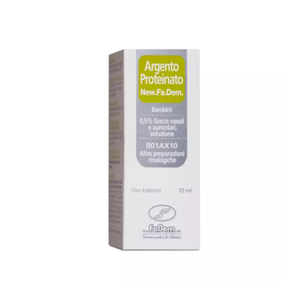 ARGENTO PROTEINATO NEW.FA.DEM. è indicato per il trattamento di infezioni causate da batteri (antisettico) della mucosa nasale e dell'orecchio esterno (condotto auricolare) e come decongestionante della mucosa del naso.