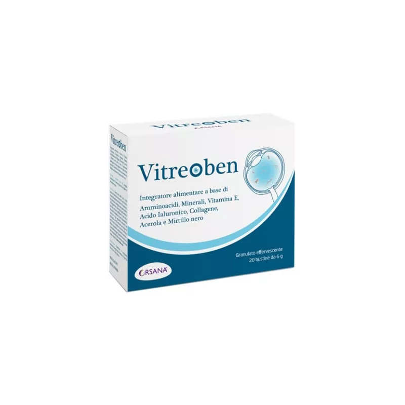 Descrizione Integratore alimentare costituito da una associazione bilanciata di oligoelementi e principi attivi che contribuiscono a contrastare i fenomeni alla base dei processi di formazione di addensamenti vitreali dovuti a: scarsa idratazione, difetti refrattivi, chirurgia oftalmica, età senile. Tali fenomeni portano alla formazione di miodesopsie (corpi mobili vitreali) o fotopsie. Vitreoben associato ad una corretta idratazione è utile ad eliminare tali sintomi.