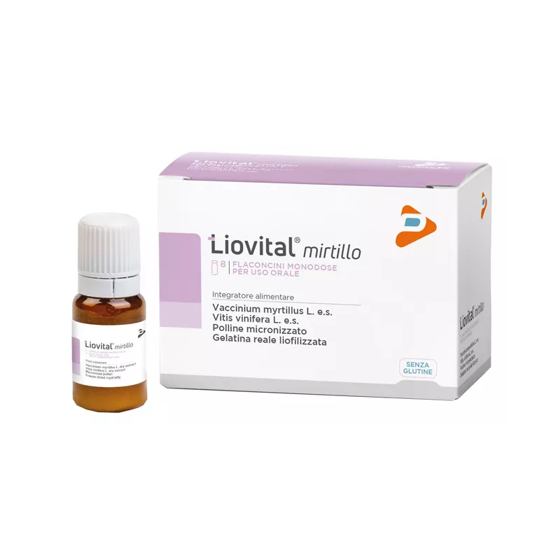 Integratore alimentare in flaconcini contiene estratti di vaccinium myrtillus e vitis vinifera a concentrazioni standardizzate di antocianosidi e oligomeri proantocianidolici. Tali bioflavonoidi sono forti antiossidanti e proteggono l’integrità dei capillari favorendo così la microcircolazione. La gelatina reale liofilizzata e l’estratto secco di polline sono sostanze facilmente assimilabili ad alto valore nutrizionale, ricche di aminoacidi essenziali, minerali, vitamine, utili come supporto in condizioni di stess, affaticamento, debilitazione. Liovital mirtillo è pertanto indicato per contrastare stati di affaticamento visivo (stress oculare da video, lettura protratta, visione in condizioni di luce artificiale o di scarsa illuminazione) e per favorire l’elasticità e la fisiologica resistenza dei vasi capillari.
