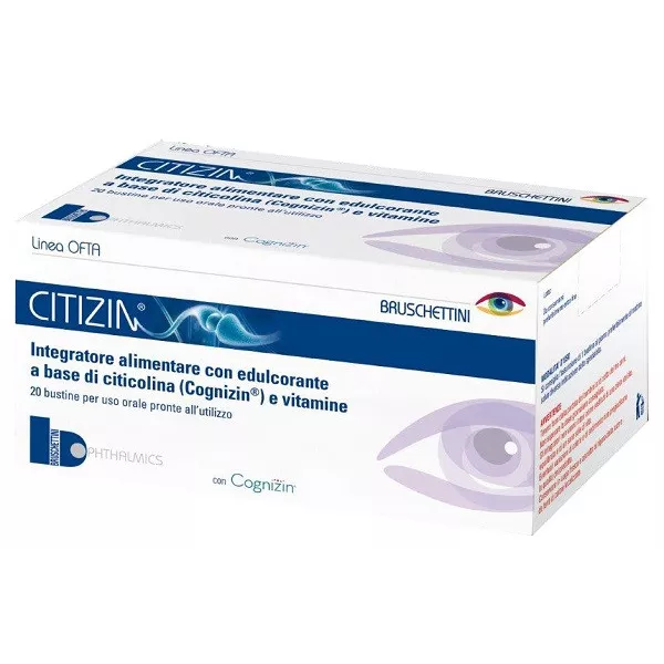 Descrizione Integratore alimentare con edulcorante a base di citicolina (Cognizin), vitamine A, C, E, vitamine del gruppo B (B1, B2, B6, biotina, B12) con estratto di ribes nero in bustine monodose per uso orale pronte all'utilizzo.