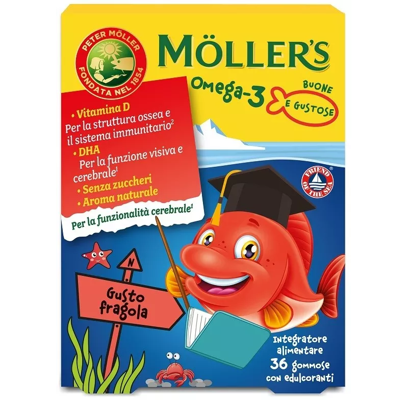Descrizione Integratore alimentare in caramelle gommose gusto fragola con concentrato di olio di pesce ricco in Omega-3 e arricchite con vitamina D3. DHA contribuisce al mantenimento della normale funzione cerebrale e della capacità visiva normale.