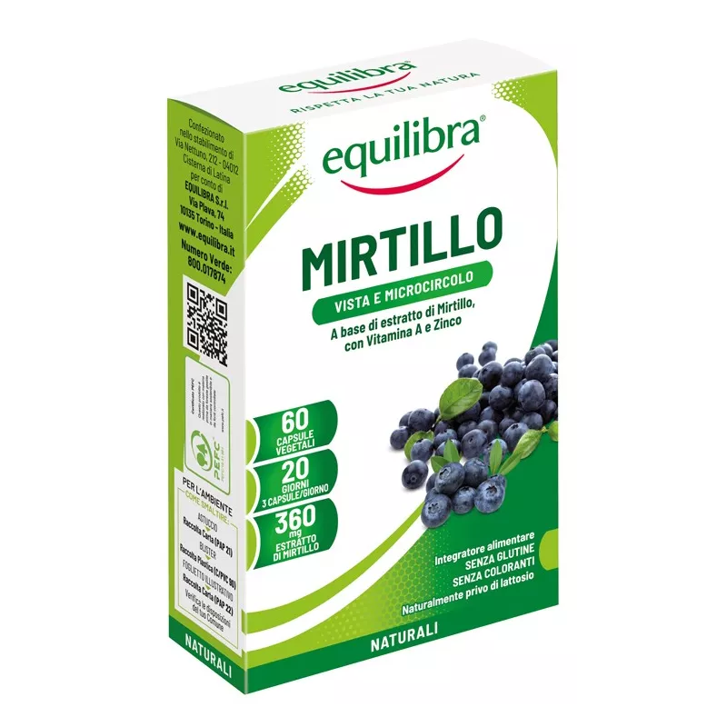 Descrizione Mirtillo Equilibra, integratore alimentare, può risultare utile in presenza di carenze alimentari o di aumentato fabbisogno grazie alla presenza di vitamina A e zinco, che contribuiscono al mantenimento della capacità visiva normale, al buon funzionamento delle membrane mucose e alla protezione dallo stress ossidativo.